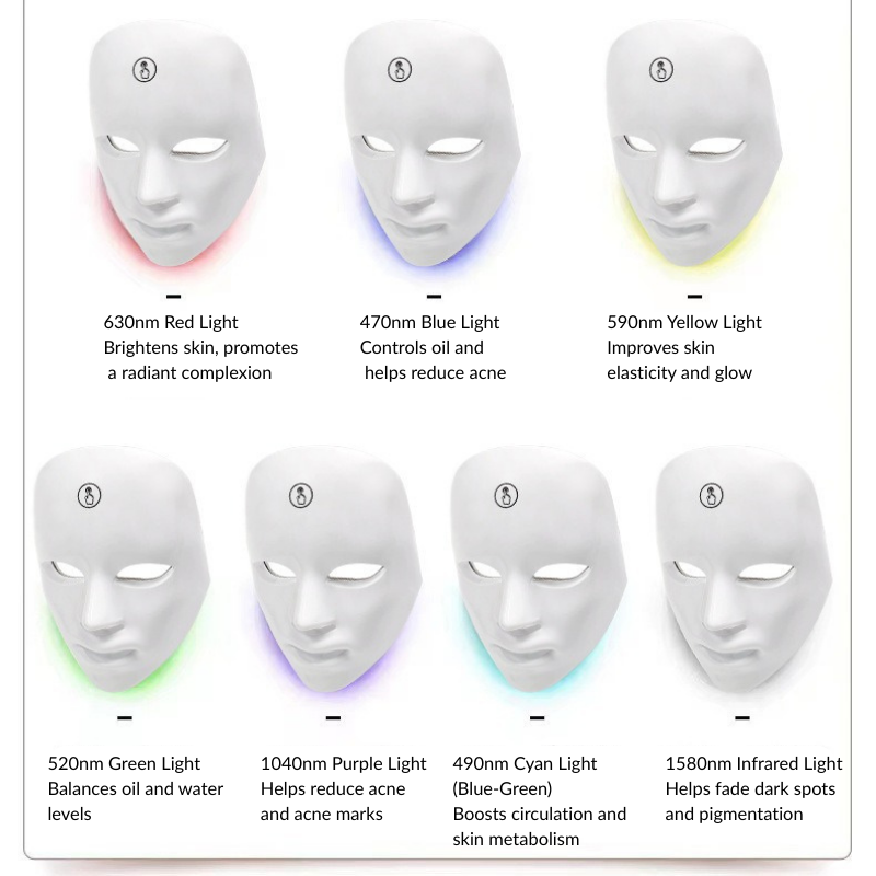 The Seven-Mode LED Facial Mask delivers targeted light therapy using clinically referenced wavelengths to address multiple skin concerns: