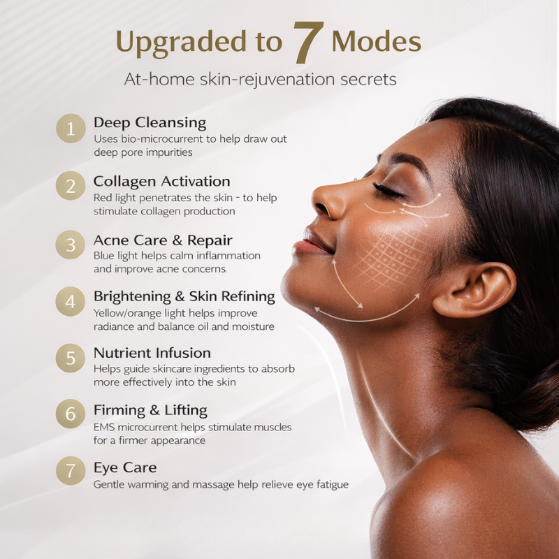 It features 7 targeted skincare modes, each designed to address a specific skin concern: