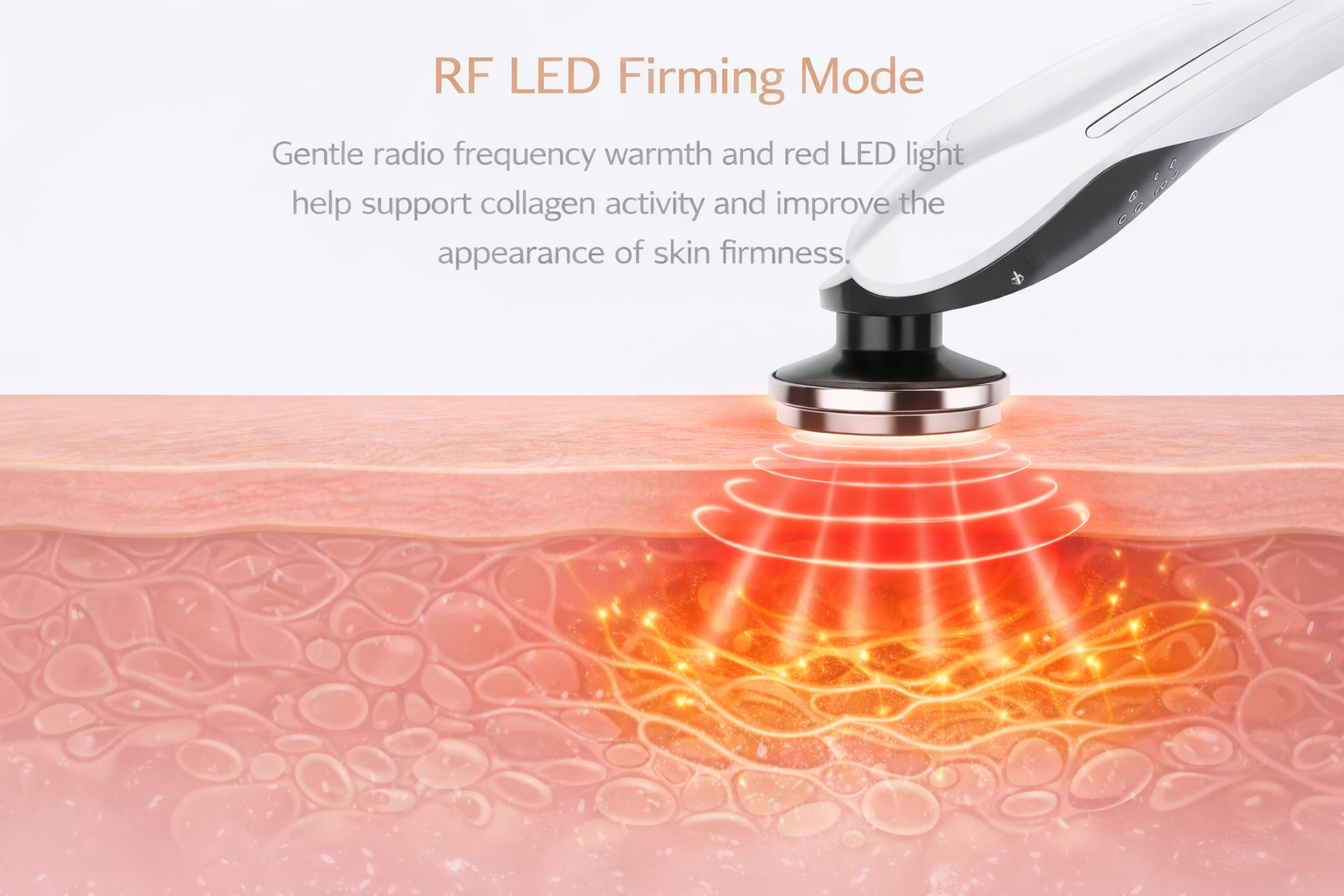 RF LED – Combines gentle radio frequency warmth with red LED light to support collagen activity and improve the appearance of skin firmness.