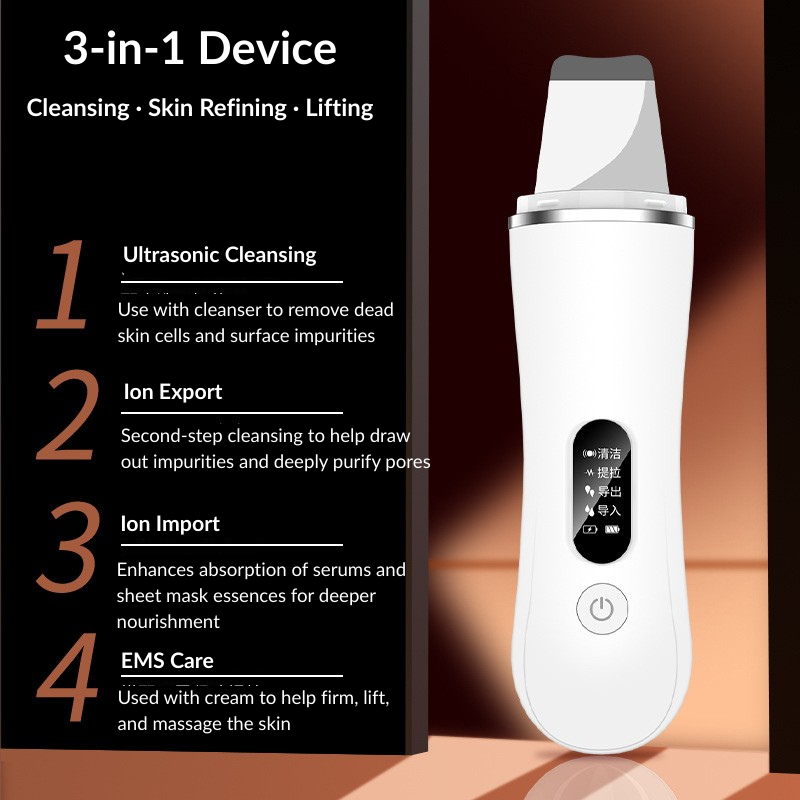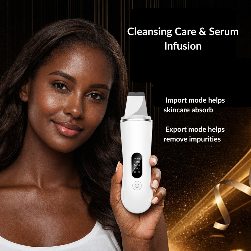The Ultrasonic Skin Scrubber is a handheld facial cleansing and exfoliation tool designed to gently lift away dead skin cells, excess oil, and surface buildup using ultrasonic vibration, ionic technology, and EMS microcurrent.